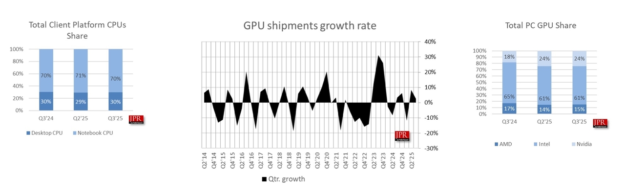 2025 yılının üçüncü çeyreğinde PC grafik işlemci (GPU) pazarında hareketlilik gözlemlendi. Jon Peddie Research (JPR) verilerine göre toplam GPU sevkiyatları bir önceki çeyreğe kıyasla yüzde 2,5 artarak 76,6 milyon adede ulaştı. Bu dönemde AMD, hem GPU hem de CPU pazarında payını artırmayı başarırken, Nvidia ve Intel’de sınırlı düşüşler yaşandı. Çeyrek bazında AMD’nin toplam GPU pazar payı yüzde 0,9 yükselirken, Nvidia yüzde 0,1 ve Intel yüzde 0,9 oranında geriledi.
