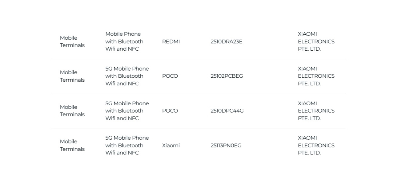 IMDA belgelerine göre Poco F8 Ultra, 25102PCBEG model numarasıyla, F8 Pro ise 2510DPC44G numarasıyla kayıtlara geçti. Global Xiaomi 17 modeli 25113PN0EG, Redmi Note 15 (4G) ise 2510DRA23E model numarasıyla listelenmiş durumda.